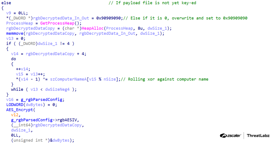 This keying process involves a rolling XOR operation to encode the payload, followed by re-encryption using AES. In the analyzed sample, StealthVector sets the first four bytes of the payload to 0x90909090, serving as an indicator that the payload has been successfully keyed.