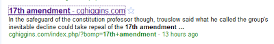 These malciious pages are accessed from spam SEO links on Google results. For example, hxxp://cghiggins.com/index.php/?bomp=17th+amendment appears on the first page for the search term "17th amendment", a popular search term on June 7th. This link redirects to the domain www2.realcleaner23p.co.cc. This domain name is typical of a fake AV page - it contains a term related to antivirus (clean) with a number, like virtually all such malicious domains that we've seen.