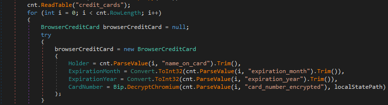It collects login data, web data, cookies, and credit card information stored in the Chromium browser.