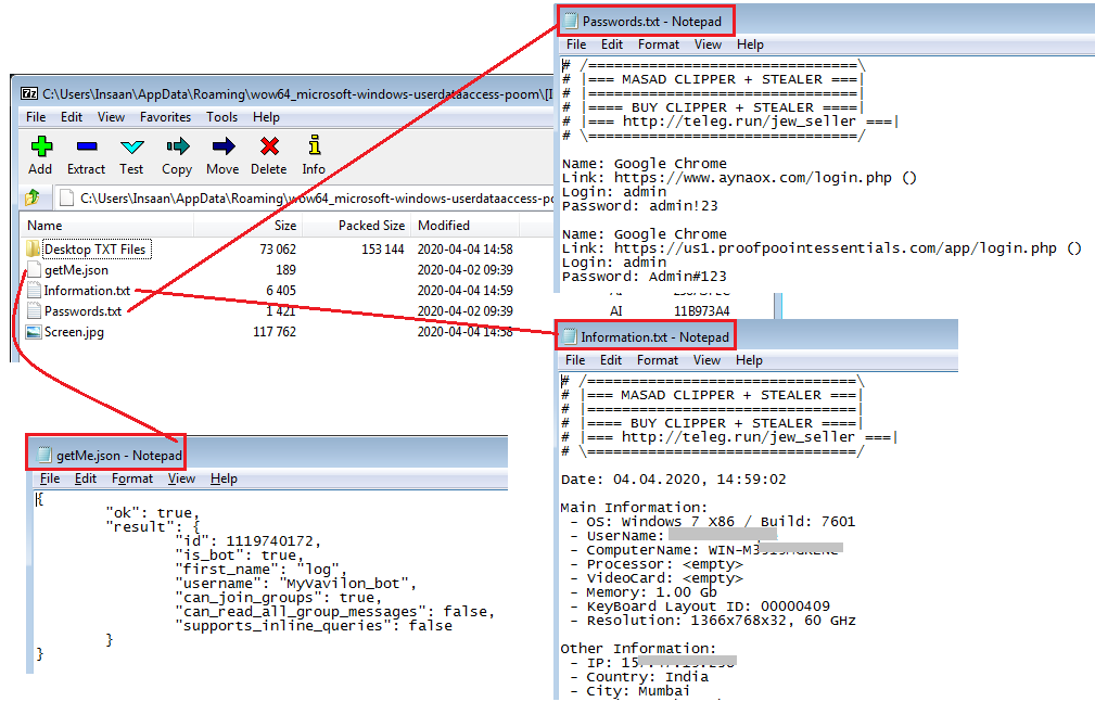 Masad Stealer uses Telegram to exfiltrate stolen information. After execution, it starts collecting sensitive information from the infected system, such as browser credentials, FTP credentials, cryptocurrency wallets, screenshots, Telegram data, and desktop files. It compresses this information into a file using the 7-ZIP utility.