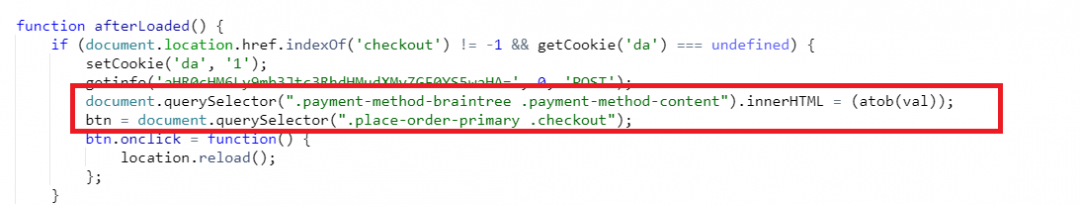 Figure 2: Skimmer loader injected inline in the compromised website.