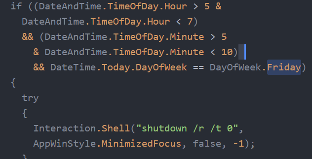 The malware sets the time in the program to shut down the system and restart on a specific day. In this example, the time should be between 5:06 a.m. and 6:09 a.m. on Friday, then the system gets shut down.