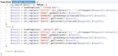 The scripts display slightly different pages for bots and users. They use two templates: trend.dot for users and default.dot for bots. The differences between the pages generated are designed to trick Google into thinking this is not a spam page. The page delivered to search engine bots has the following characteristics:
