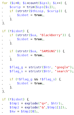 - Client IP address check - The script has a list of IP addresses/ranges which are considered to be bots. They are known Google IP addresses. A similar list can be seen at SEO-Wolf. It is interesting to see that, once again, attackers care primarily about Google, not Yahoo or Bing.