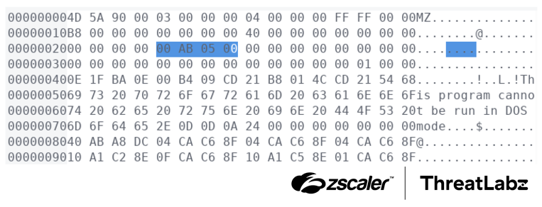 During the installation phase, Zloader version 2.9.4.0 creates a copy of the original executable with a modified MZ header at offset 0x24, which is reserved for the OEM identifier and OEM information. The value at this offset serves as a pointer to the .rdata location where the MD5 hash value address is located. An example of the modified Zloader MZ header field at offset 0x24 is shown in the figure below: