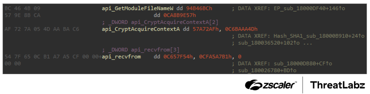 return checksum ^ xor_constantZloader also now dynamically calculates the index of the DLL name to resolve functions from in each case. Before, the code only had a single DWORD value with the checksum to resolve, and the index of the DLL was hardcoded. Now, Zloader uses two DWORDs per function to determine the DLL and function name. The figure below shows an example of several API functions and the corresponding DWORD values used for the resolution.