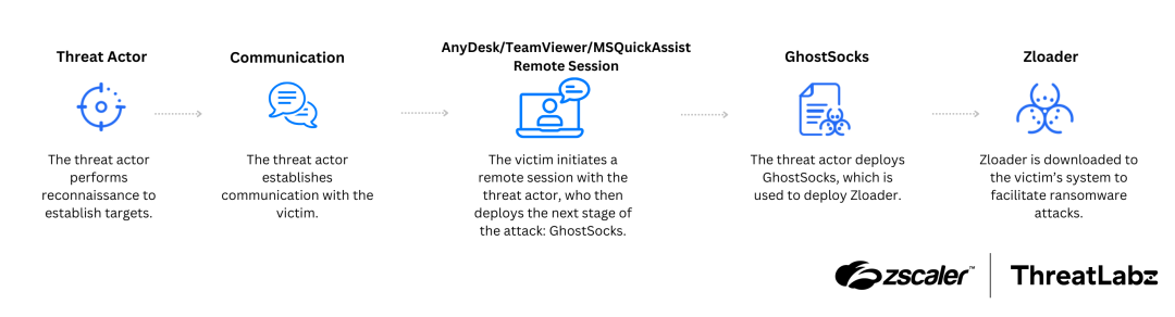 The distribution of Zloader has become more small-scale and targeted, which has become an increasingly popular trend among initial access brokers including those that are affiliates of Black Basta ransomware. This trend has led to a shift away from large-scale spam campaigns to more personalized voice-based attacks over the past year. ThreatLabz has observed Zloader deployed through a multi-stage infection chain starting through Remote Monitoring and Management (RMM) tools including AnyDesk, TeamViewer, and Microsoft Quick Assist. Furthermore, we have identified an additional malicious payload in the attack chain, which is known as GhostSocks. We assess with medium to high confidence that this payload was used to deploy Zloader as shown in the figure below: