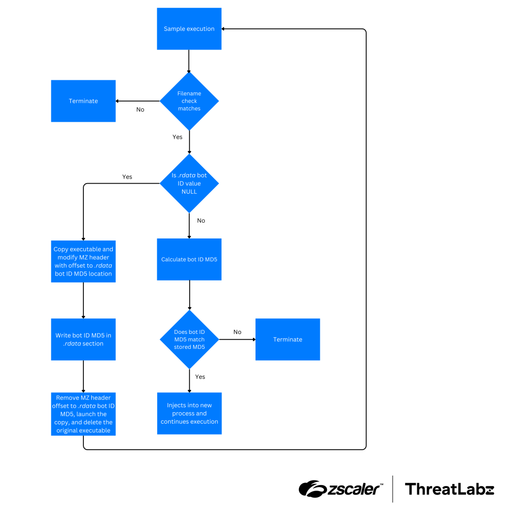 Zloader then retrieves a value within the executable’s .rdata section, which will be NULL if the Zloader executable has not been used to infect a system. If the Zloader executable has been used to infect a system, this value will be filled in by Zloader as part of the infection process. If the MD5 hash of the bot ID matches the expected value after installation, Zloader will continue execution. However, if this field is not NULL and does not match the expected hash value of the bot ID, Zloader will terminate. This environment check serves as an indication to the malware that the Zloader executable has been transferred to another environment (e.g., a malware sandbox or an analyst system).