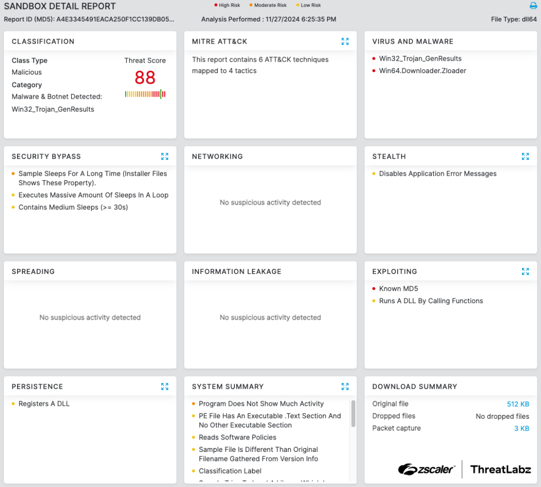 In addition to sandbox detections, Zscaler’s multilayered cloud security platform detects indicators related to Zloader at various levels with the following threat names: