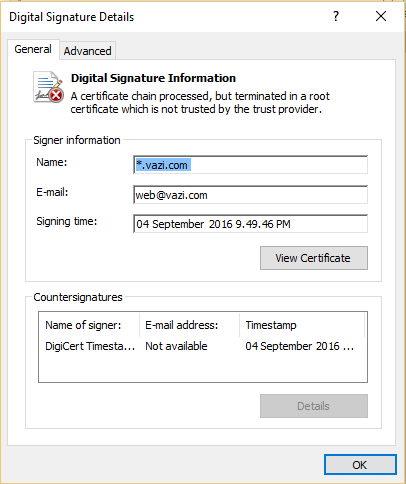 Figure 2: Certificate used by .Net Crypter