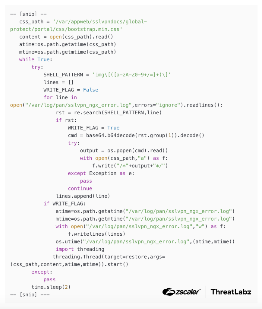 Then, it goes into an infinite loop and starts monitoring the error log file at /var/log/pan/sslvpn_ngx_error.log looking for one of the following regular expressions: img\[([a-zA-Z0-9+/=]+)\] or img\{base64encoded_command}\ as shown in the code snippet below.