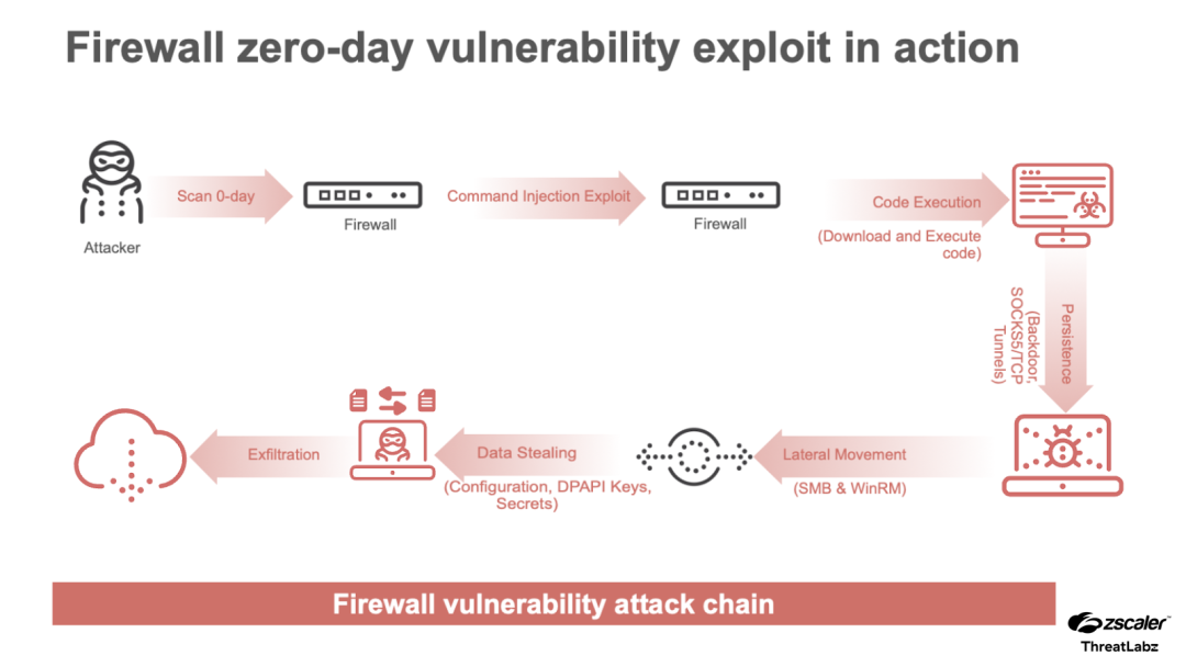 Figure 1: The possible firewall-based attack chain enabled by the PAN-OS zero-day vulnerability.