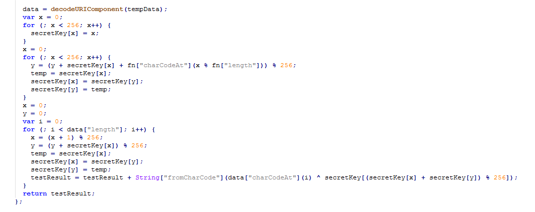 The above injected obfuscated script hxxps://dnsden[.]biz/a.js contains encrypted data which is decrypted by the RC4 algorithm in the runtime.