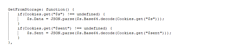 The malicious JavaScript code first checks for the two cookie names “$s” and “$sent”; if these cookies are set, data is stored into variable after decoding. These cookie values are referred to each time any payment card details are being entered, and values are updated if the payment card details are new.