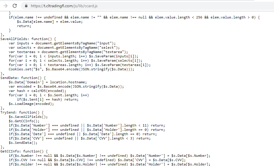 Fig 12: Malicious JavaScript code hosted on a compromised site for skimming payment card details