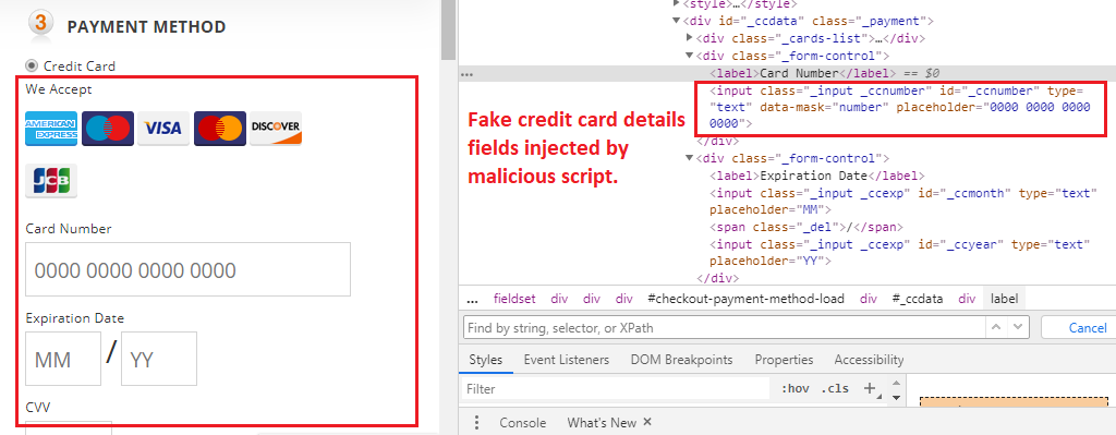 The injected and legitimate credit card fields look similar, but from the HTML input field attributes (ID and type), there are noticeable differences. In the injected fields, the card number ID is "_ccnumber" and the type is "text," while in a legitimate card number, the ID is "credit-card-number" and the type is "tel."