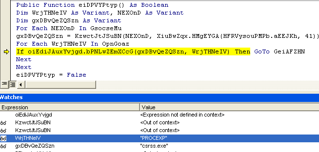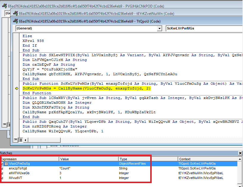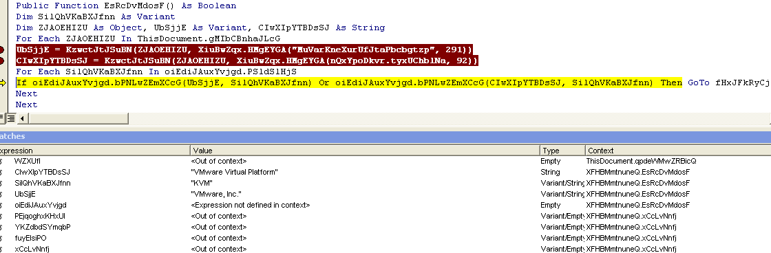 Malware authors are also making the macro code highly obfuscated and difficult to detect by signature based systems. In addition to highly obfuscated macros, malware authors are using multiple techniques in macros to detect the virtual environment and automated analysis systems as seen below: