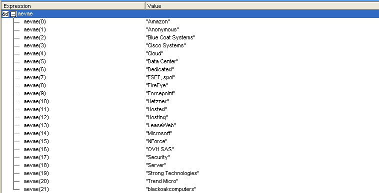 The response is then compared against a predetermined list of strings (Figure X) that includes multiple known security vendors & hosting services as well as generic strings to detect data centers, hosting services, cloud based security and hosting services ownership. The macro execution will terminate if maxmind's response for the external IP address matches any of these strings.