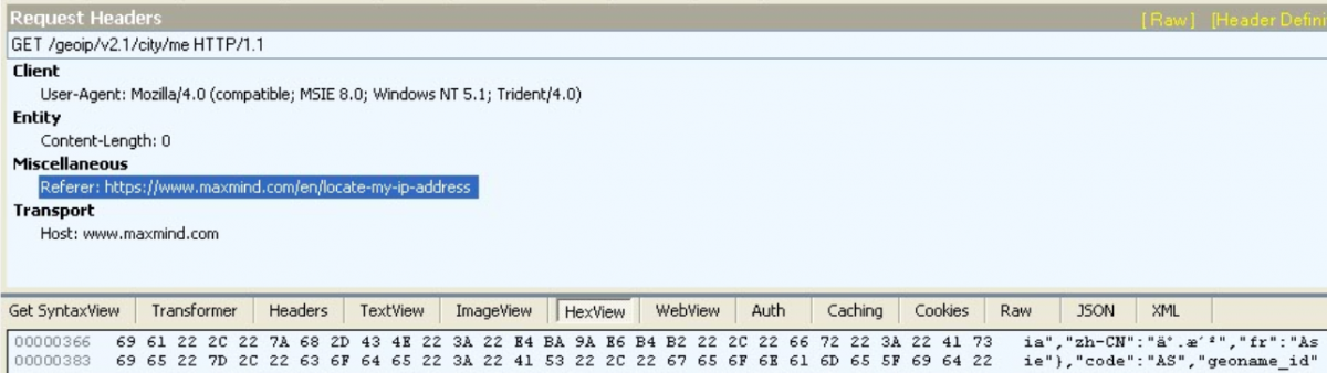 Here the malware author is leveraging macro to get the external IP address of the victim's system by using the following maxmind GeoIP service API: