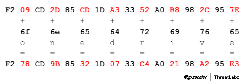 The first 16 bytes of the resource contain an encoded key for the payload that follows it. Each of the first 8 lowercase characters (onedrive) of the current process filename is added to every second byte of the encoded key to derive the XOR key F2 78 CD 9B 85 32 1D 07 33 C4 A0 21 98 A2 95 E3, as shown in the figure below. This prevents the correct decoding of the next stage payload if Secur32.dll was not sideloaded by OneDrive.exe.