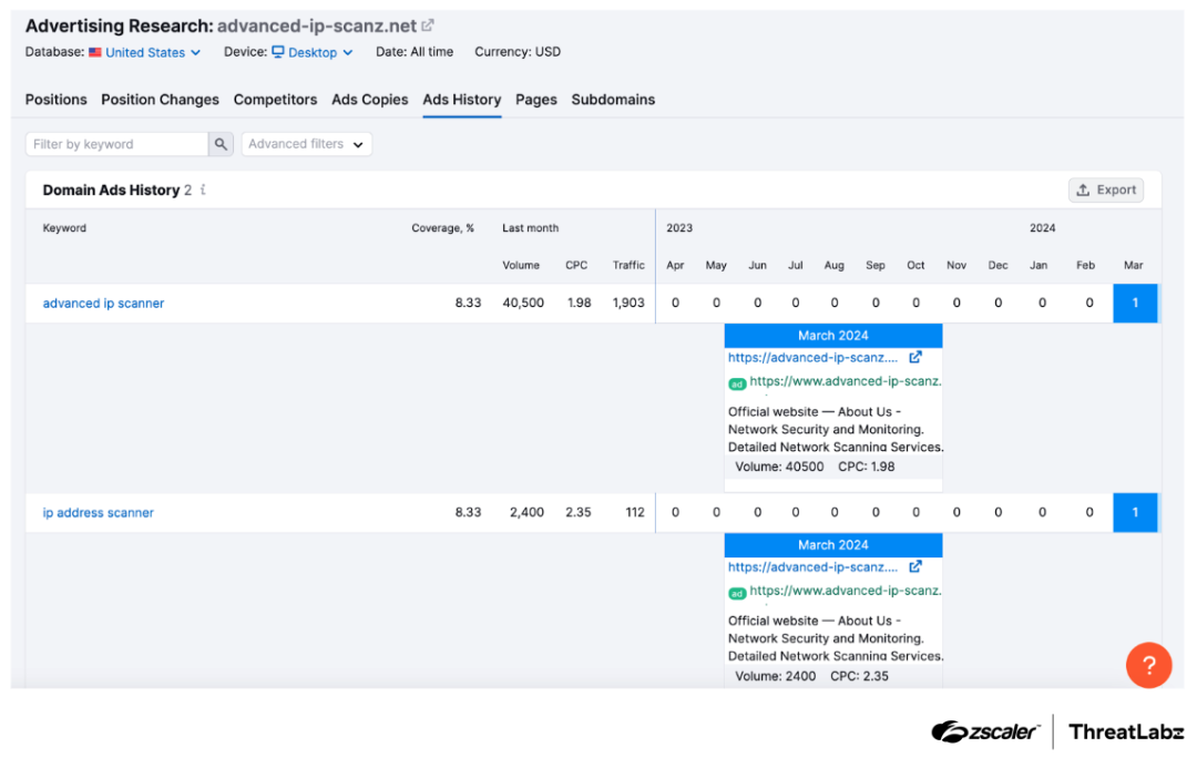 The figure below shows details of the Google Ads campaign carried out by the threat actor in March 2024 for one of the malicious domains. The domain in question was advanced-ip-scanz[.]net, and the search keywords were: