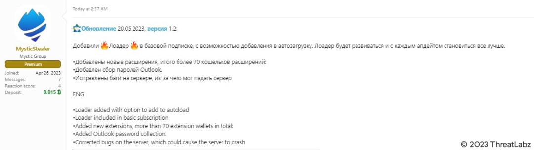 Figure 1. MysticStealer forum post advertising v1.2 update with loader support
