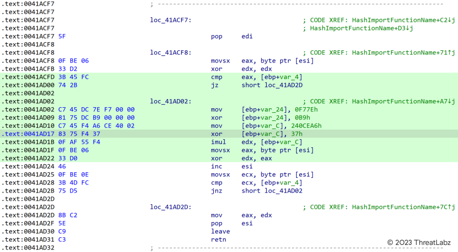 Dynamic constant calculation. Constant values in the code are obfuscated and dynamically calculated at runtime. For example, the API hashing algorithm shown above uses the constant 0x240CE91. However, this constant does not directly exist in the code. Instead, the value 0x240CEA6 is present and the code performs an XOR operation with the value 0x37 to produce the actual constant 0x240CE91 as shown in Figure 3.