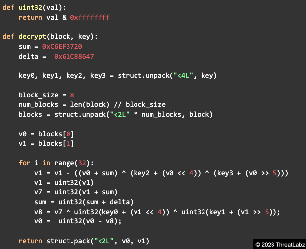 The builder enables operators to specify up to four C2 endpoints. This is often used in crimeware to provide resiliency in case some servers are offline or blocklisted. In Mystic Stealer binaries, there are two arrays consisting of 4 DWORDs each that are encrypted with a modified XTEA-based algorithm. Thus, each sample can configure up to 4 IP addresses and ports. A Python-based implementation of the decryption algorithm for Mystic C2s is shown below: