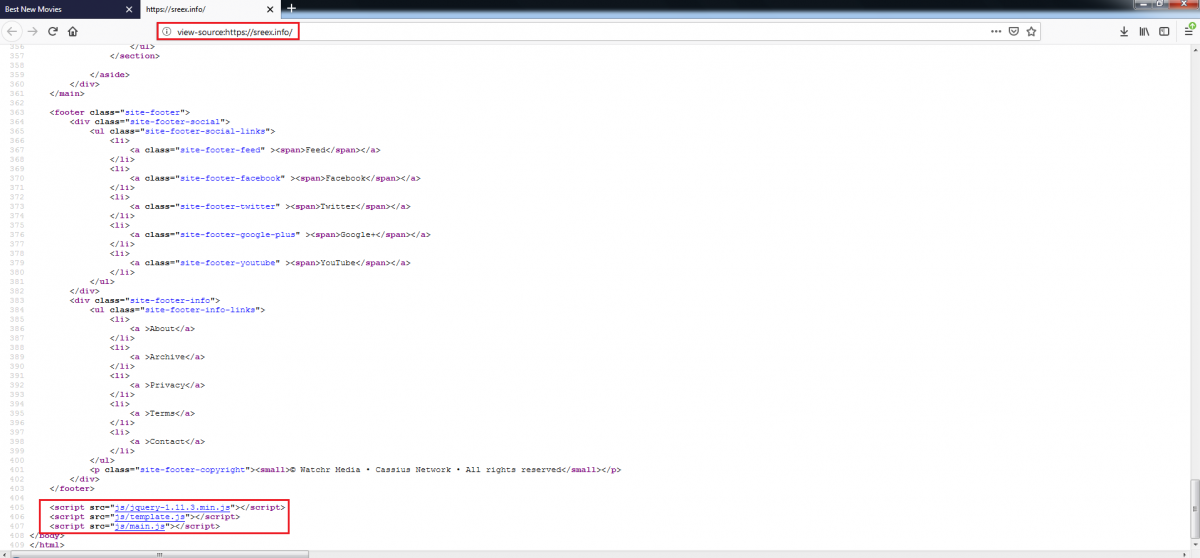 Figure 21: The source code of the template.js script with the malware download link