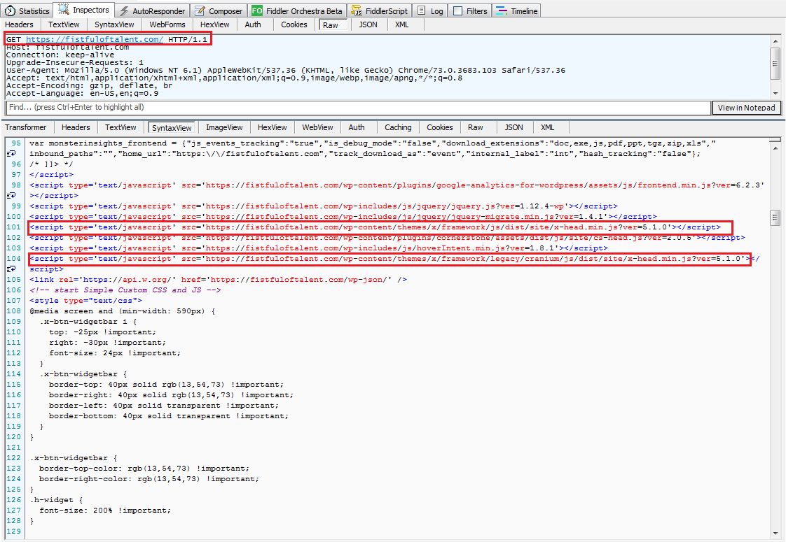 The following figure shows the source code of the compromised website with the injected scripts.