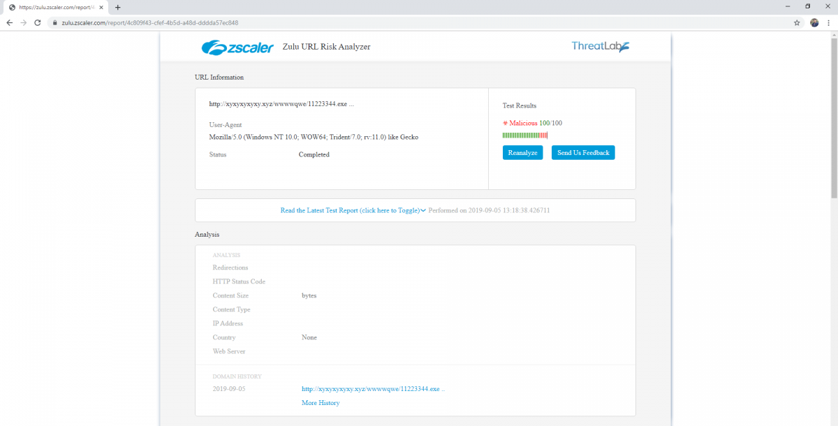 Figure 28: The Zscaler Risk Analyzer score for the malware payload download URL