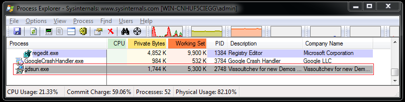 Figure 23: The program created a process “gdsun.exe”  from the malware payload (a self-copy of the payload)