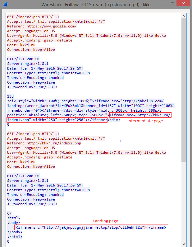 The content served by the advertising networks consisted of two iframe injections. One served the advertising content, which typically pulled from casino-related game sites. The other requested PHP page from the same host, which would serve yet another iframe that pointed to one of several Neutrino landing page domains hosted on the same IP. After multiple requests to the intermediary page, the host would stop serving the iframe redirect and instead serve a blank page, making enumerating the associated landing pages challenging.