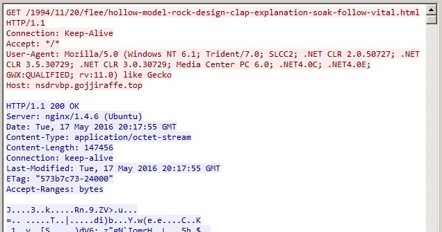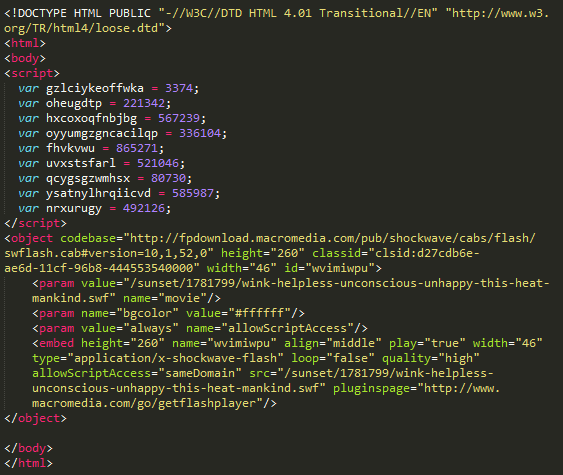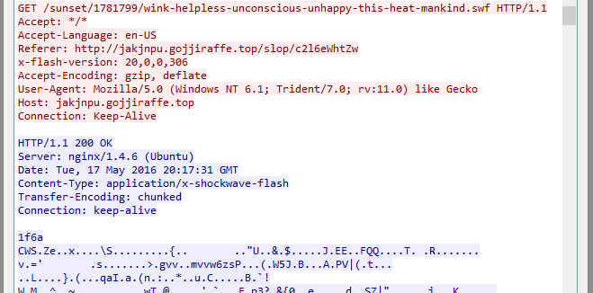 Neutrino EK landing pages are fairly unsophisticated, usually just an embedded Flash object as compared to Angler’s landing pages containing highly obfuscated JavaScript. The landing page observed in this campaign is identical to most other Neutrino landing pages we have seen recently; nothing more than an embedded Flash exploit, in line with common Neutrino resource naming convention.