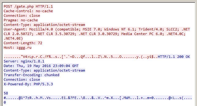 The sample attempted to contact a command and control server hosted on a domain with a similar naming scheme to the original malicious site. Other samples seen in the campaign contacted similar domains, hosted on different IPs. At one point, the botnet C2 was hosted on the same IP as the malicious domain. We observed Gamarue downloading additional modules from the callback domain.