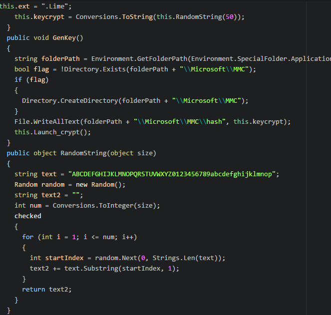When Lime is first launched, it will call a RandomString() function, which will attempt to generate an AES key. It generates a 50-byte array from the input string using a random index, and uses the random() function to fetch one character and stores it to the output string. Lime drops the output string at %AppData%\\Microsoft\\MMC\\hash location.