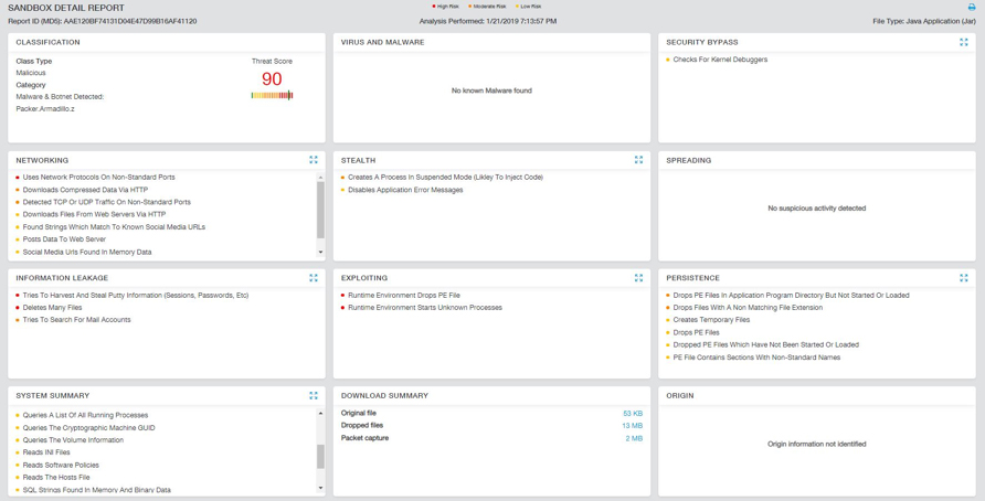 We first saw this payload hit Zscaler Cloud Sandbox on Jan 21, 2019, and below is a screenshot of the detonation report.