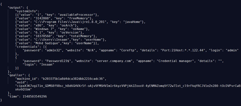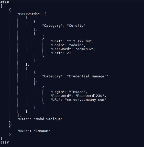 The output of the QaZagne on an infected Windows machine is shown in Fig 12. It is in JSON format and contains the credentials of CoreFTP and a Windows credential manager. It always starts with #fs# and ends with #ff#.