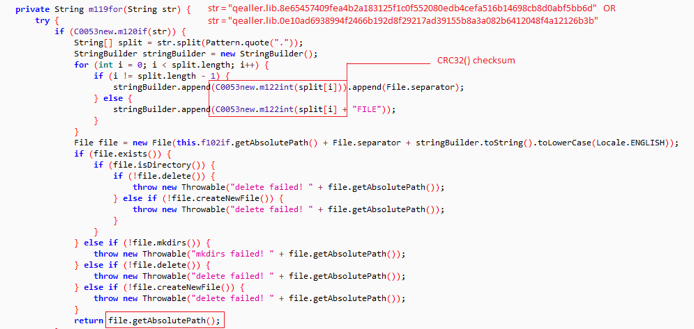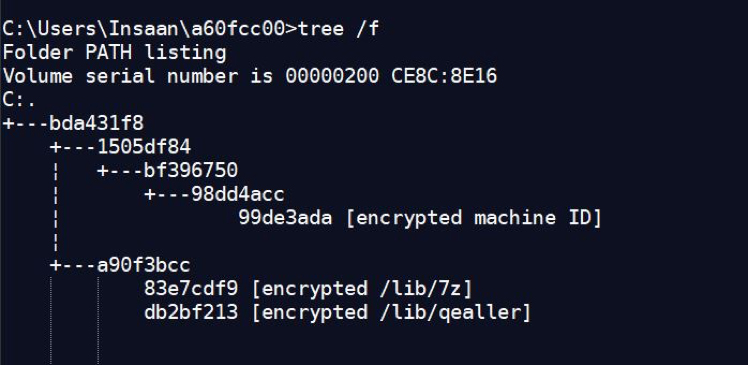 %USERPROFILE%\\CRC32(“2a890bc98aaf6c96f2054bb1eadc9848eb17633039e9e9ffd833104ce553fe9b”)\\CRC32(“qealler”)\\CRC32(“lib”)\\CRC32(“8e65457409fea4b2a183125f1c0f552080edb4cefa516b14698cb8d0abf5bb6dFILE”)
