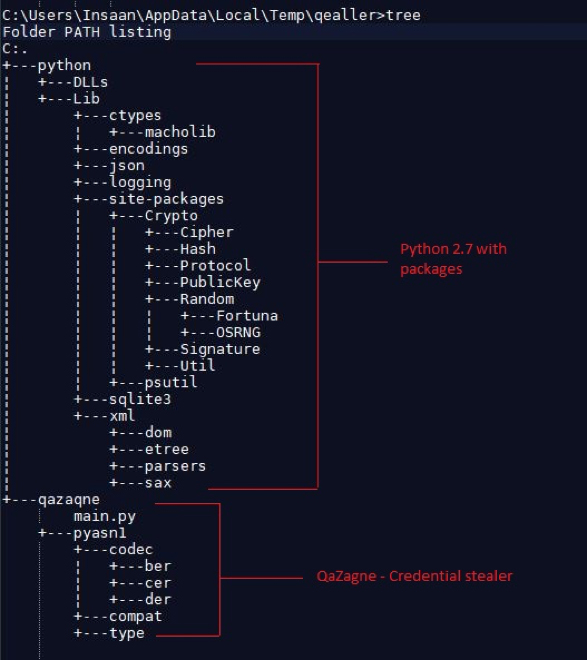 The Qealler also has a directory named QaZaqne. It is a custom version of the open source project called LaZagne. LaZagne is used to retrieve lots of passwords stored on a local computer. This is the same functionality of QaZagne, which finds and steals credentials of the most commonly used software from local machines.